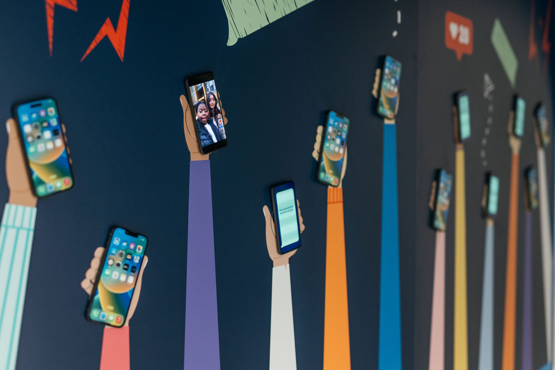 Smartphone displays presented student-made videos styled as social media posts, alongside a motion-triggered TV display and atmospheric DMX lighting.