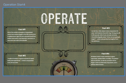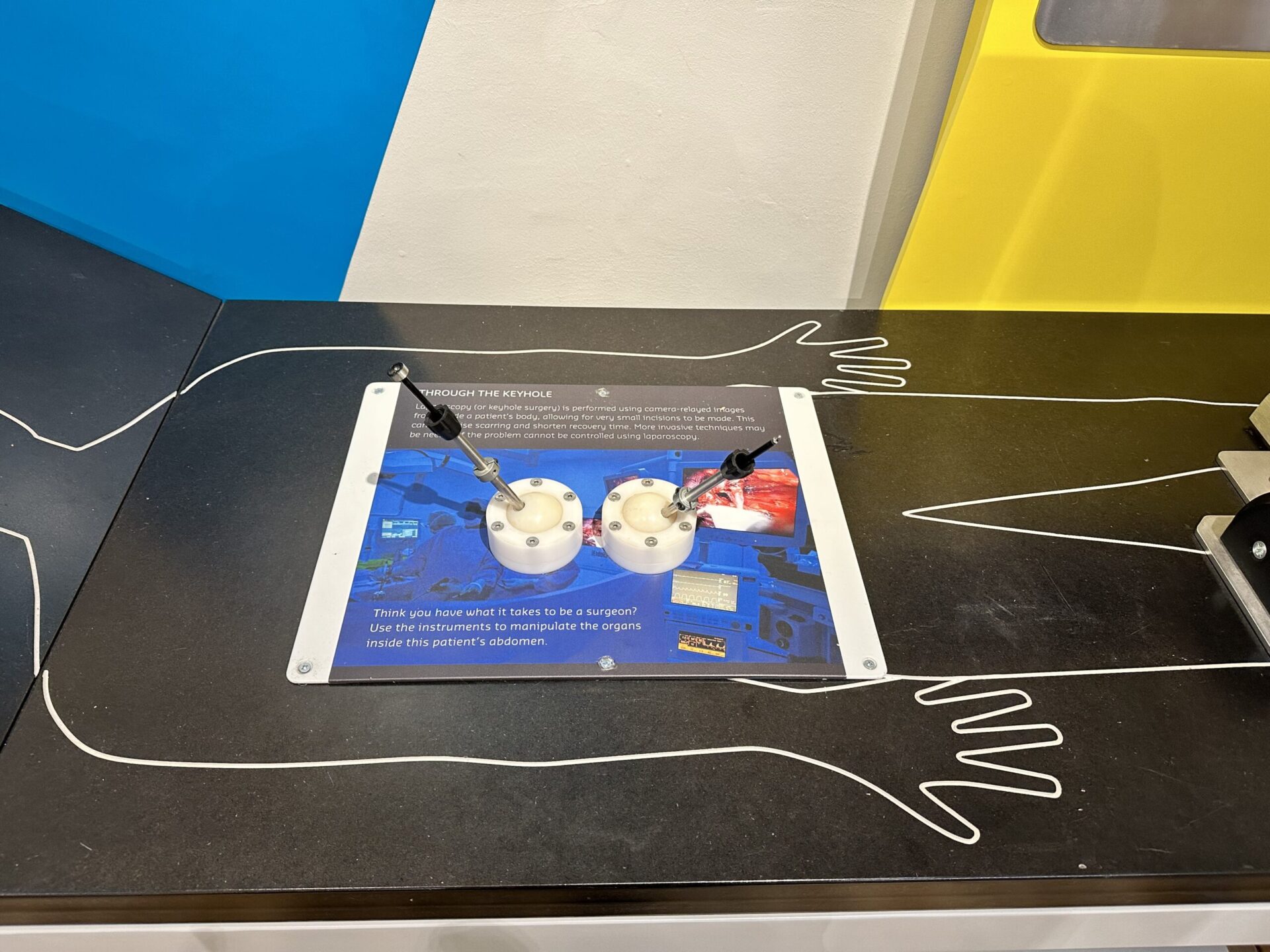 In collaboration with Hadley Interiors, we developed interactive AV experiences demonstrating the history of medicine. Using physical sensors, cameras, and NFC tags, visitors could engage with tangible objects to explore topics like keyhole surgery, amputations, and microscopy. For example, the amputation game required users to move a real saw at a steady pace indicated on screen, while a camera feed allowed visitors to manipulate instruments inside a simulated body. Another activity used NFC “petri dishes” to display detailed information and adjustable magnification on a screen.